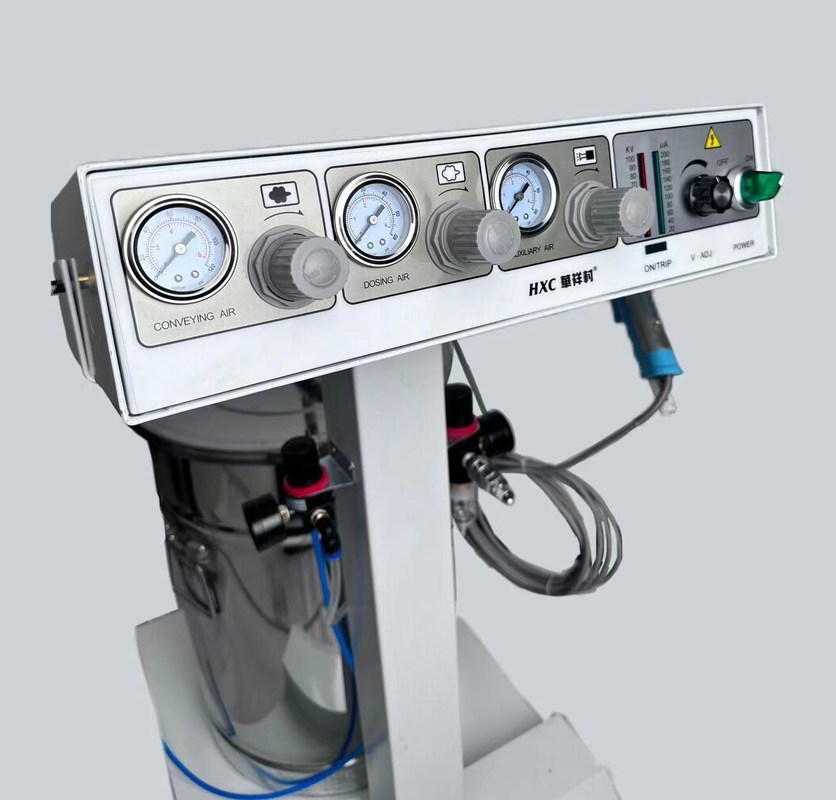 5.HXC máquina de revestimento de pó eletrostático é tipicamente aplicada eletrostaticamente e é então curada sob calor para permitir que ela flua e forme uma "pele".Aplicar o revestimento de pó eletrostático a objetos é dar carga elétrica negativa ao pó, que é então pulverizado em direcção à sua peça de trabalho por eletrostática de alta tensão e, em seguida, a potência será atraída para a peça de trabalho.
